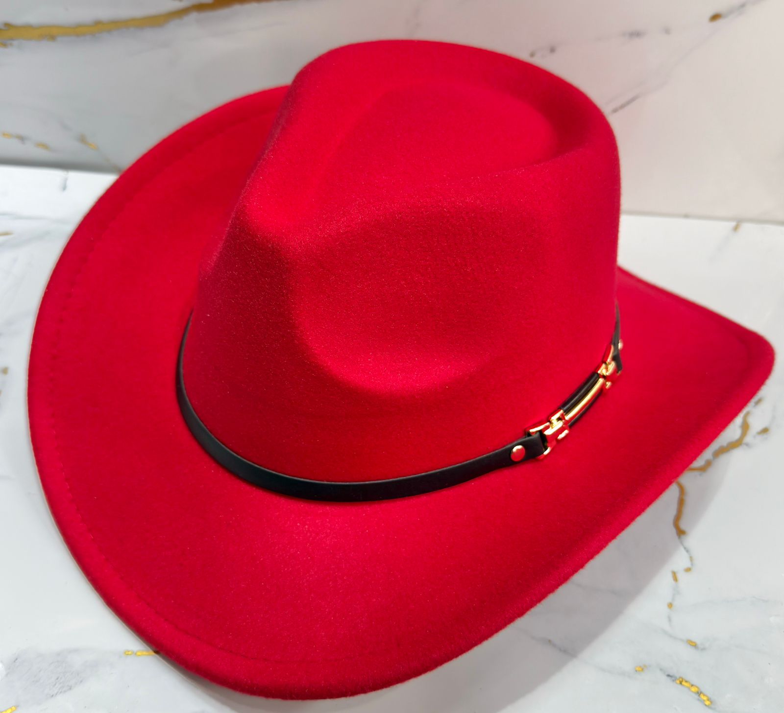 Detalles: Cuenta con una banda negra simple alrededor de la base de la copa, la cual está asegurada con un adorno de hebilla metálica dorad