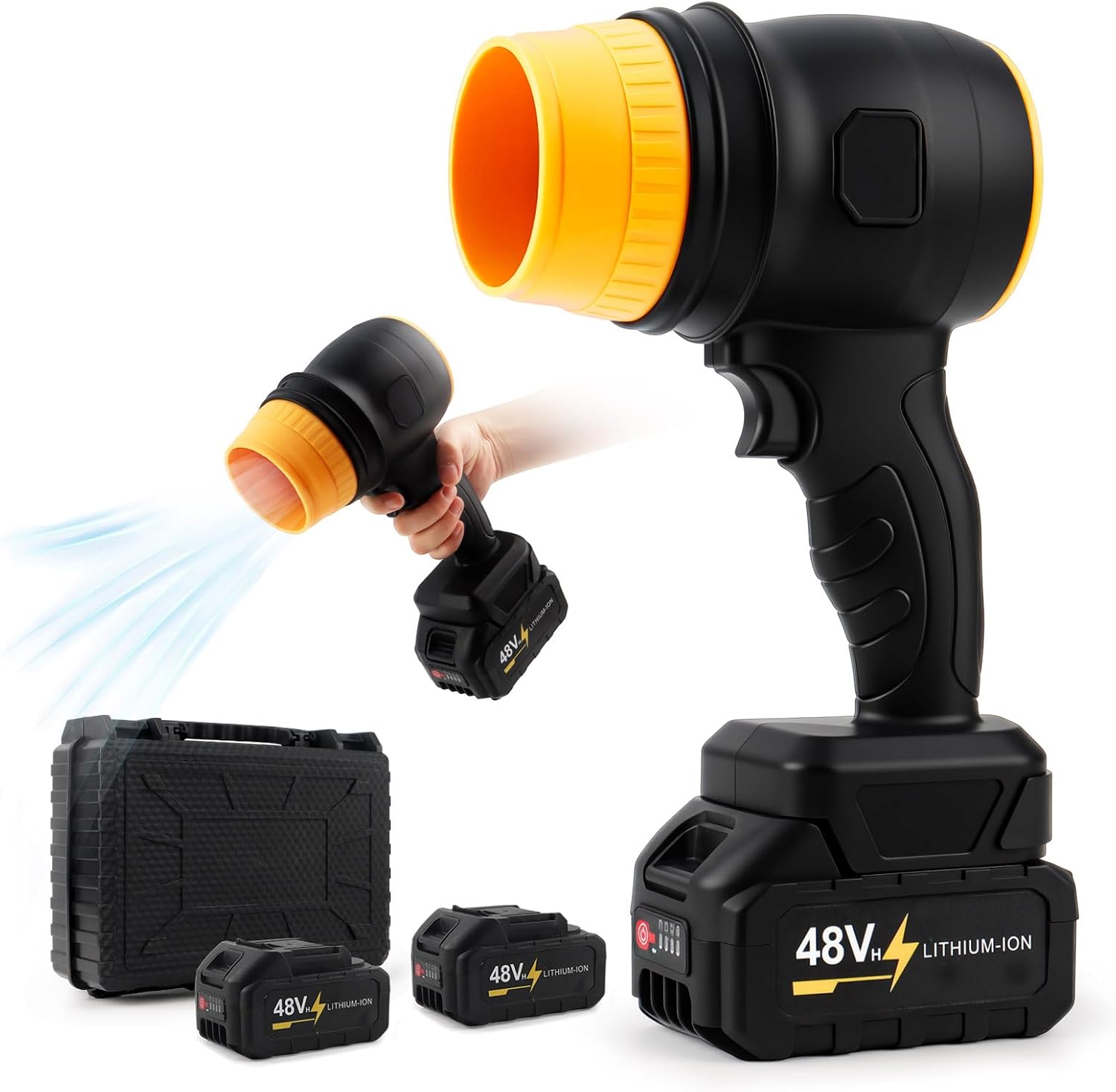 La sopladora eléctrica inalámbrica de 48V es una herramienta potente y ligera diseñada para limpiar hojas, polvo y residuos en diferentes espacios como jardines, patios, garajes o vehículos.