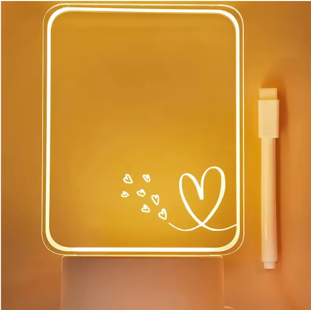 Dale un toque único a cualquier espacio con esta lámpara LED personalizable, perfecta para escribir mensajes, recordatorios, frases motivadoras o dibujos. Su diseño minimalista en acrílico transparente con borde iluminado crea un efecto moderno y elegante, ideal para habitaciones, oficinas, escritorios o como regalo especial.