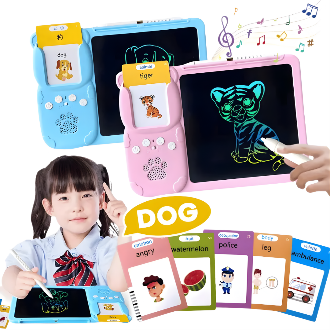 Incluye tarjetas educativas intercambiables: Animales, frutas, emociones, profesiones, partes del cuerpo, vehículos y más.