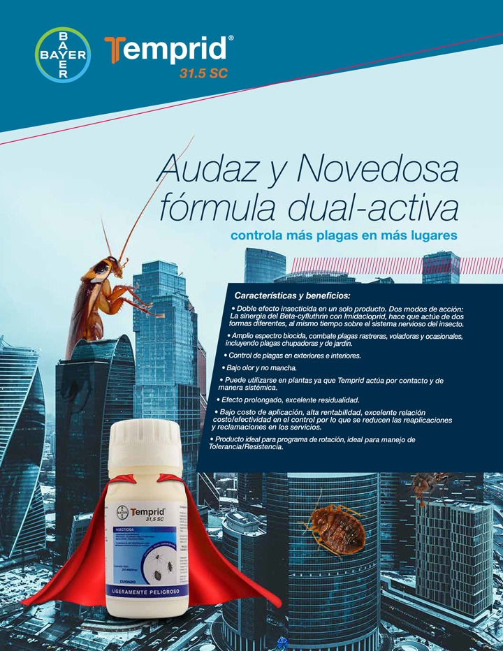 Temprid® SC es una solución innovadora diseñada para el control eficaz de plagas en ambientes residenciales, comerciales, industriales y rurales. Su fórmula en suspensión concentrada combina dos ingredientes activos: Imidacloprid (Neonicotinoide) y β-Cyfluthrin (Piretroide), los cuales actúan sinérgicamente tanto por ingestión como por contacto, generando un efecto letal y de derribo inmediato sobre el sistema nervioso de los insectos.