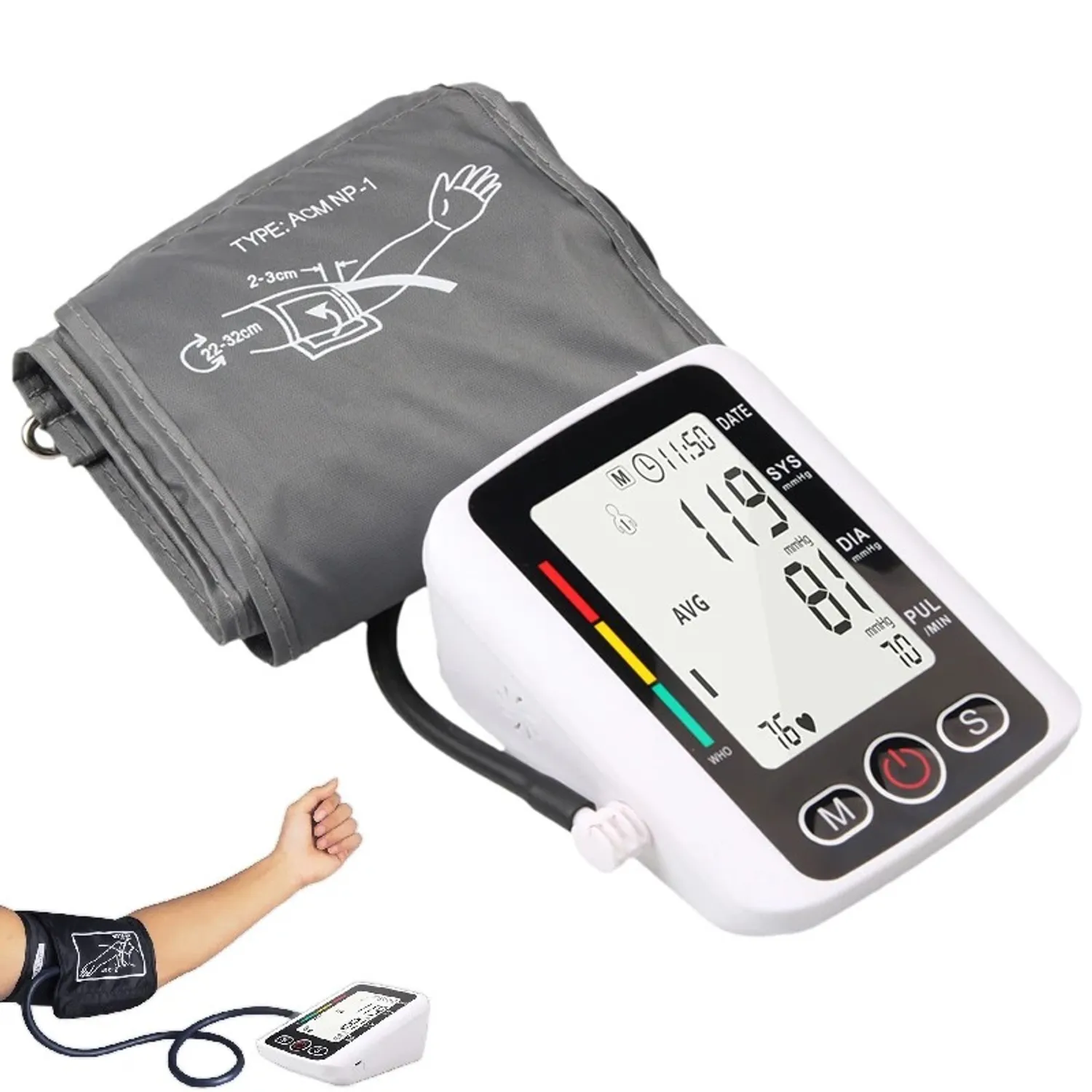 TENSIÓMETRO ELECTRÓNICO CON FUNCIÓN DE VOZ DE BRAZO Este tensiómetro electrónico de brazo superior es un monitor de presión arterial automático digital. Cuenta con una máquina de prueba de ritmo cardíaco y una función de voz. El dispositivo tiene una señal de bajo voltaje de la batería e icono de latido del corazón. Muestra la presión alta (presión sistólica) y la presión baja (presión sistólica). Cuenta con grupos de usuario y número de visualización de pulso. Se apaga automáticamente cuando no se realiza ninguna operación durante 1 minuto. CARACTERÍSTICAS: * Pantalla LCD grande para una lectura digital automática clara. Los resultados de la medición son claros de un vistazo. * Con función de transmisión de voz. Mide la presión sanguínea con un botón, sin botones complicados ni necesidad de ajustes. * La tecnología de detección puede capturar cada fluctuación sutil de la presión arterial, ajustar automáticamente la presión presurizada y acortar el tiempo de medición. ESPECIFICACIONES: * Parámetros: digital automático * Función de voz Versión en inglés. * Posición de medición: brazo. * Material: ABS PAQUETE INCLUYE: * 1 Monitor de presión arterial (no incluye baterías) * 1 Brazalete * Instrucciones