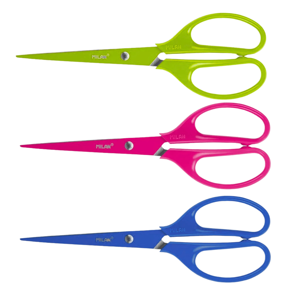 La tijera Milan Oficio 17 cm es una herramienta versátil y funcional diseñada para uso escolar, oficina y manualidades. Su tamaño proporciona un equilibrio ideal entre precisión y comodidad, permitiendo realizar cortes limpios en papel, cartulina y otros materiales ligeros.