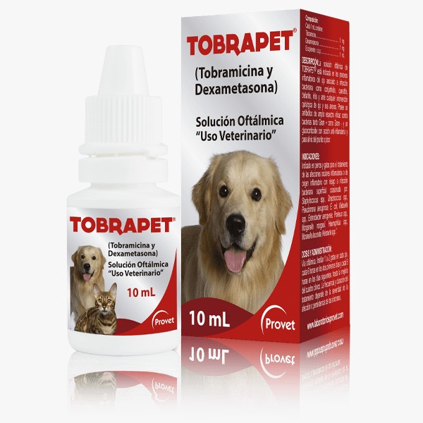 La solución oftálmica de Tobrapet® está indicada en los procesos inflamatorios del ojo asociado a infección bacteriana como conjuntivitis, queratitis, blefaritis, dacriocistitis, iritis, después de la extracción de cuerpos extraños de la córnea y la conjuntiva y ante cualquier intervención quirúrgica de ojo y sus anexos. Posee un antibiótico de amplio espectro eficaz contra bacterias tanto Gram + como Gram -, y un glucocorticoide con acción anti-inflamatoria y para alivio del prurito o picor.
