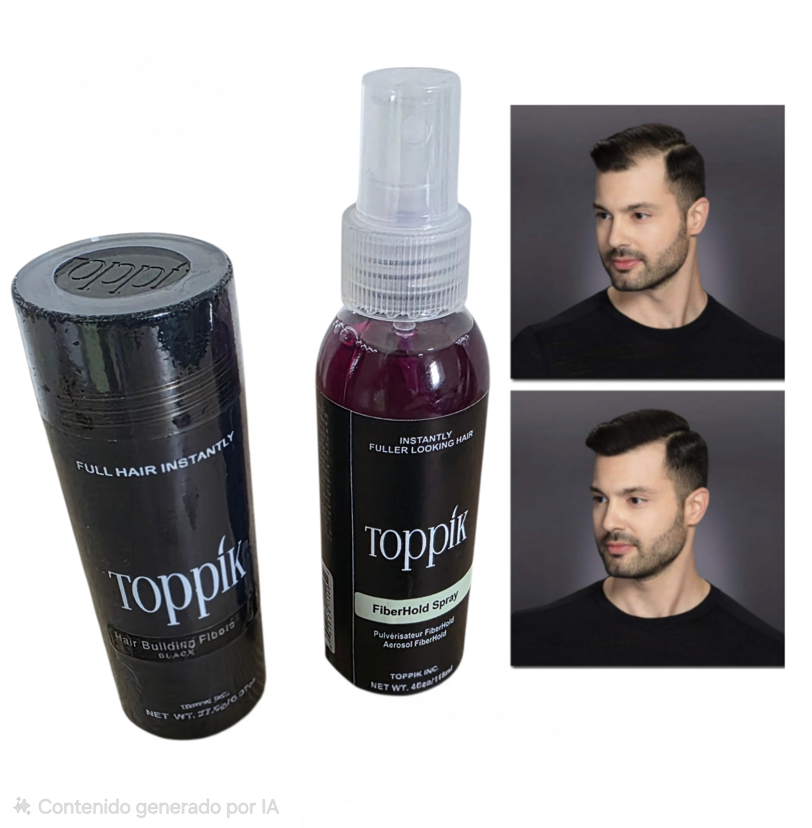 El kit Toppik con fijador es una solución integral de maquillaje capilar diseñada para hombres y mujeres, que utiliza microfibras de queratina natural para ocultar la escasez de cabello, aportando densidad instantánea de manera natural. El sistema incluye fibras, un fijador (FiberHold Spray) para asegurar resultados duraderos frente a viento y lluvia, siendo resistente hasta el próximo lavado