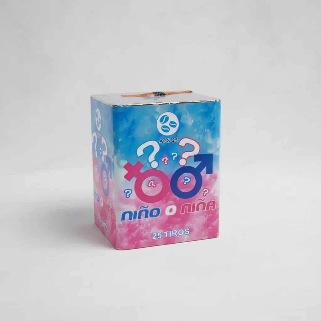 ¡Haz que el momento más esperado sea inolvidable! Nuestra torta de revelación de género está diseñada para crear un espectáculo emocionante y lleno de color. Con 25 detonaciones consecutivas que iluminan el cielo en un vibrante tono azul o un tierno color rosado, es la forma más impactante y festiva de anunciar si será niño o niña. Ideal para celebraciones familiares y eventos de Gender Reveal al aire libre.