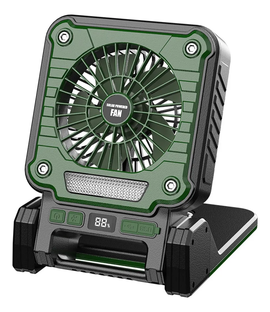Mantente fresco en cualquier lugar con este ventilador portátil recargable, perfecto para camping, viajes, picnic, trabajo o uso en casa. Su diseño resistente y compacto permite llevarlo fácilmente y colocarlo en diferentes posiciones para mayor comodidad.