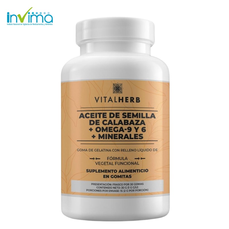Aceite de Semilla de Calabaza + Omega-9 y 6 + Minerales de Vitalherb es un suplemento alimenticio formulado para complementar rutinas de bienestar orientadas al equilibrio nutricional y al soporte del organismo.